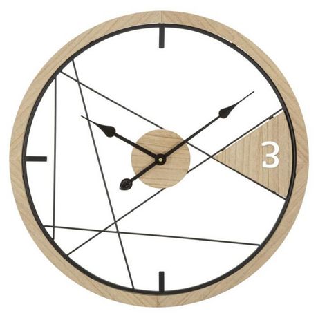Informations Techniques : Dimensions : L. 60 x l. 2,5 x H. 60 cm Matières : Métal & MDF Spécificités : Élégante & Utile Horloge murale ronde Design géométrique Pile non incluse Type de pile : 1 x AA Poids : 1,5 kg Couleur : Naturel & Noir