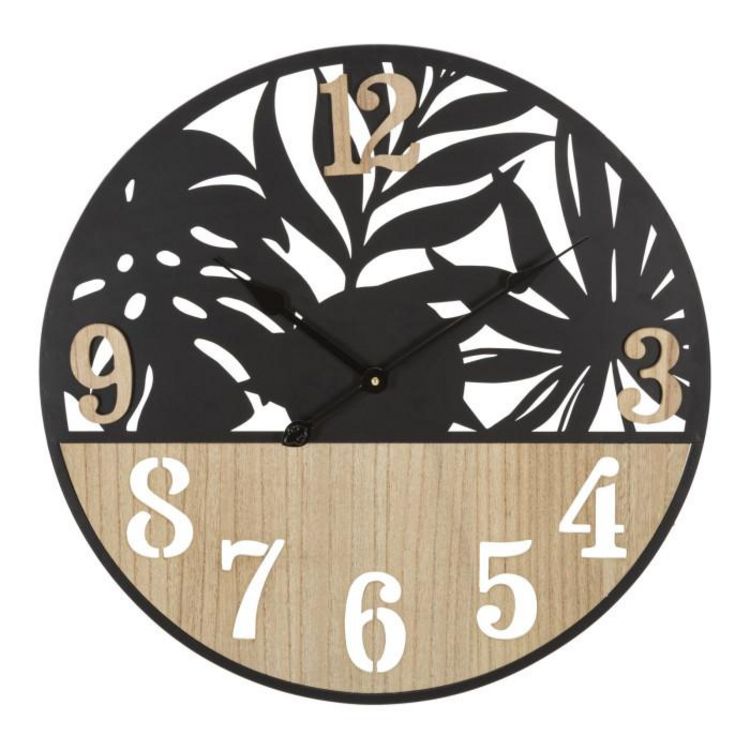 Informations Techniques : Dimensions : L. 60 x l. 2,5 x H. 60 cm Matières : Métal & MDF Spécificités : Déco & Utile Horloge murale ronde Design feuilles tropicales Chiffres analogiques Pile non incluse Type de pile : 1 x AA Poids : 1,7 kg Couleur : Naturel & Noir