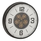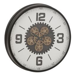 Informations Techniques : Dimensions : L. 60 x l. 9,5 x H. 60 cm Matières : 35% Métal, 35% MDF & 30% Verre Spécificités : Déco & Rétro Horloge murale ronde Design engrenage Chiffres analogiques Poids : 5,14 kg Couleur : Noir & Blanc