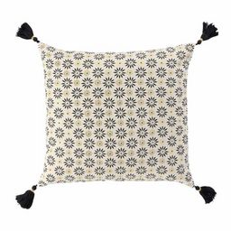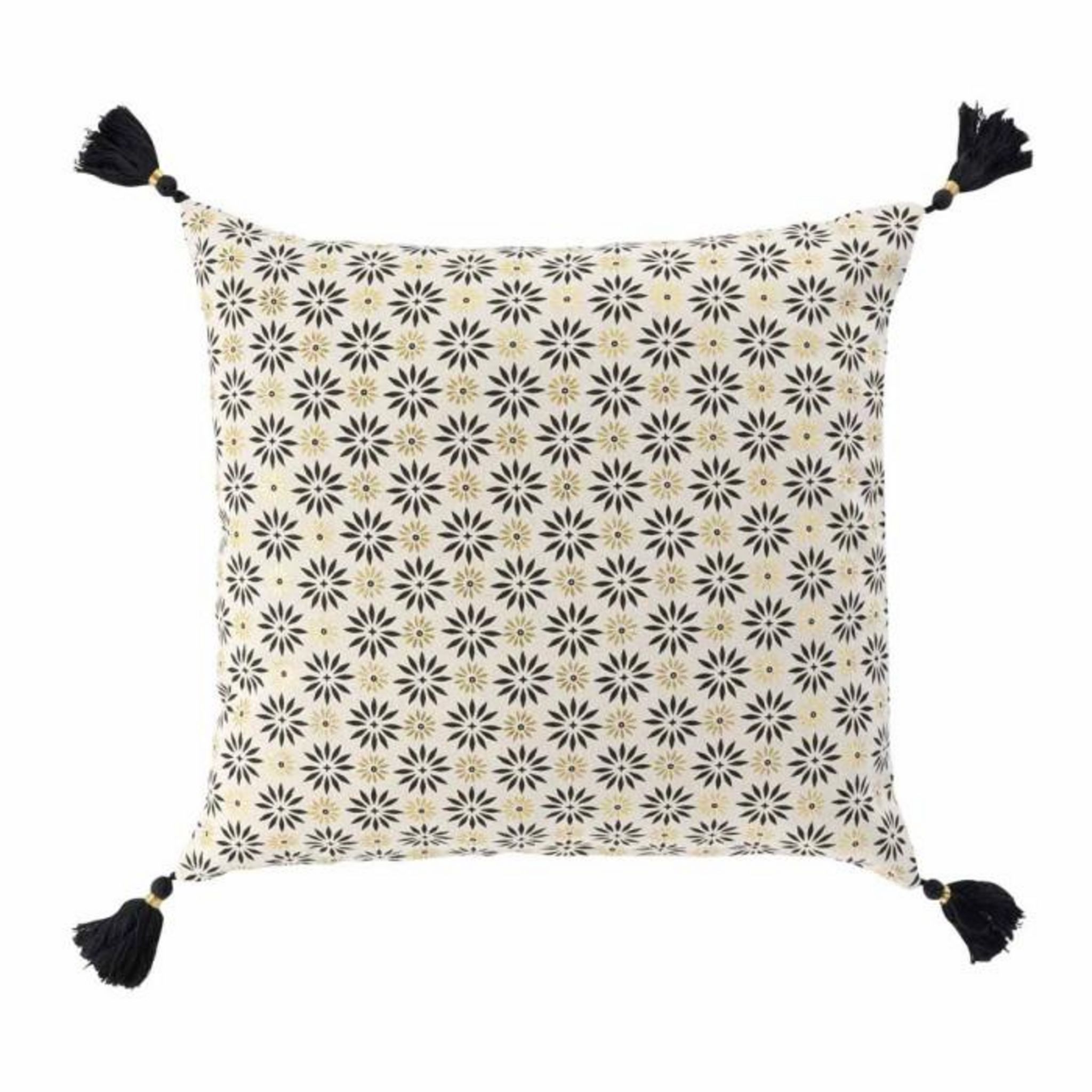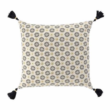 Informations Techniques : Dimensions : L. 40 x l. 40 cm Matière : Coton Spécificités : Déco & Tendance Housse de Coussin Forme Carré A Pompons A Motifs Poids : 0,145 kg Couleur : Or, Beige & Noir