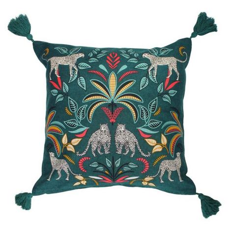 Informations Techniques : Dimensions : L. 40 x l. 40 cm Matière : 100% Coton Spécificités : Déco & Fantaisie Housse de coussin carré Avec pompons Imprimé jungle Label Okeo-Tex Entretien : Lavage à la main Pas de séchage en machine Pas de repassage Poids : 0,08 kg Couleur : Bleu