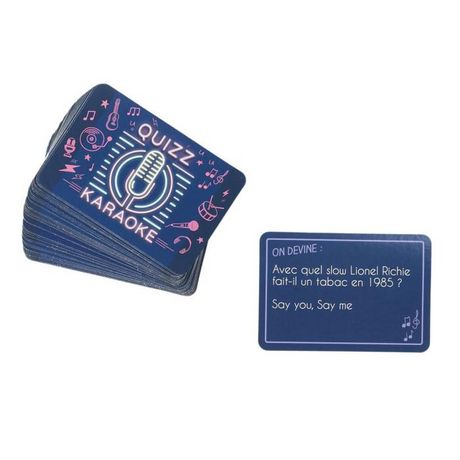 Informations Techniques : Dimensions : L. 9,5 x l. 6,5 cm Matière : Papier Spécificités : Amusant & Ludique Jeu de 60 Cartes Jeu Quizz Karaoké A Motifs Facile d'Utilisation Poids : 0,12 kg Couleur : Bleu