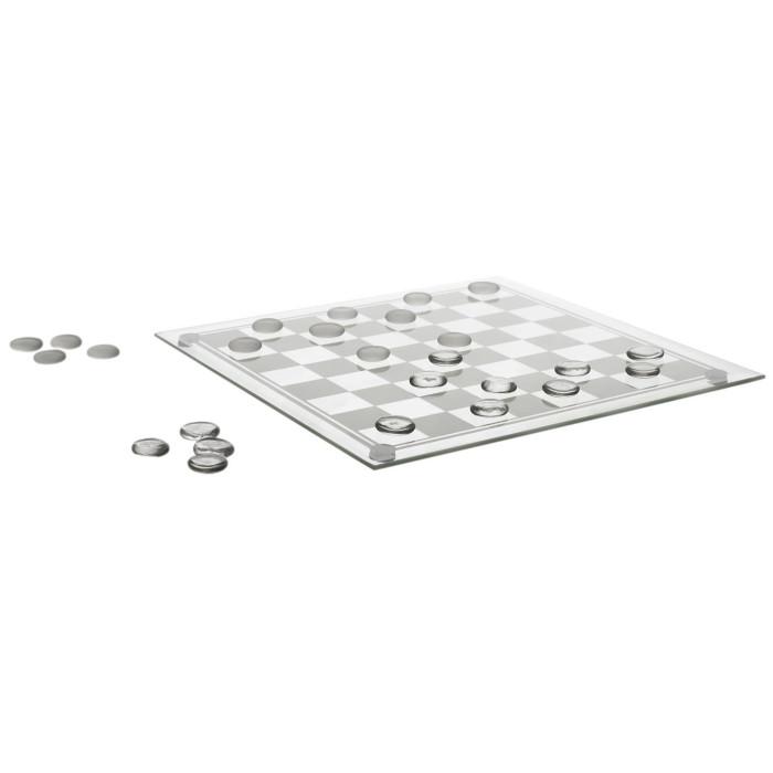 Informations Techniques : Dimensions : L. 25 x l. 25 cm Matière : Verre Spécificités : Gadget & Fun Jeu de Société Dames Forme Carrée Contient : 1 Plateau 42 Pions Style Vintage & Rétro Poids : 0,48 kg Couleur : Transparent