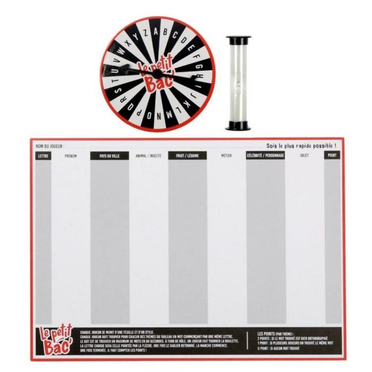 Informations Techniques : Dimensions : L. 29,7 x l. 21,5 cm Matière : Papier Spécificités : Pratique & Utile Jeu du Baccalauréat 50 Feuilles Contient 1 Roulette & 1 Sablier De 7 à 77 ans Règle du jeu incluse Couleur : Gris & Blanc