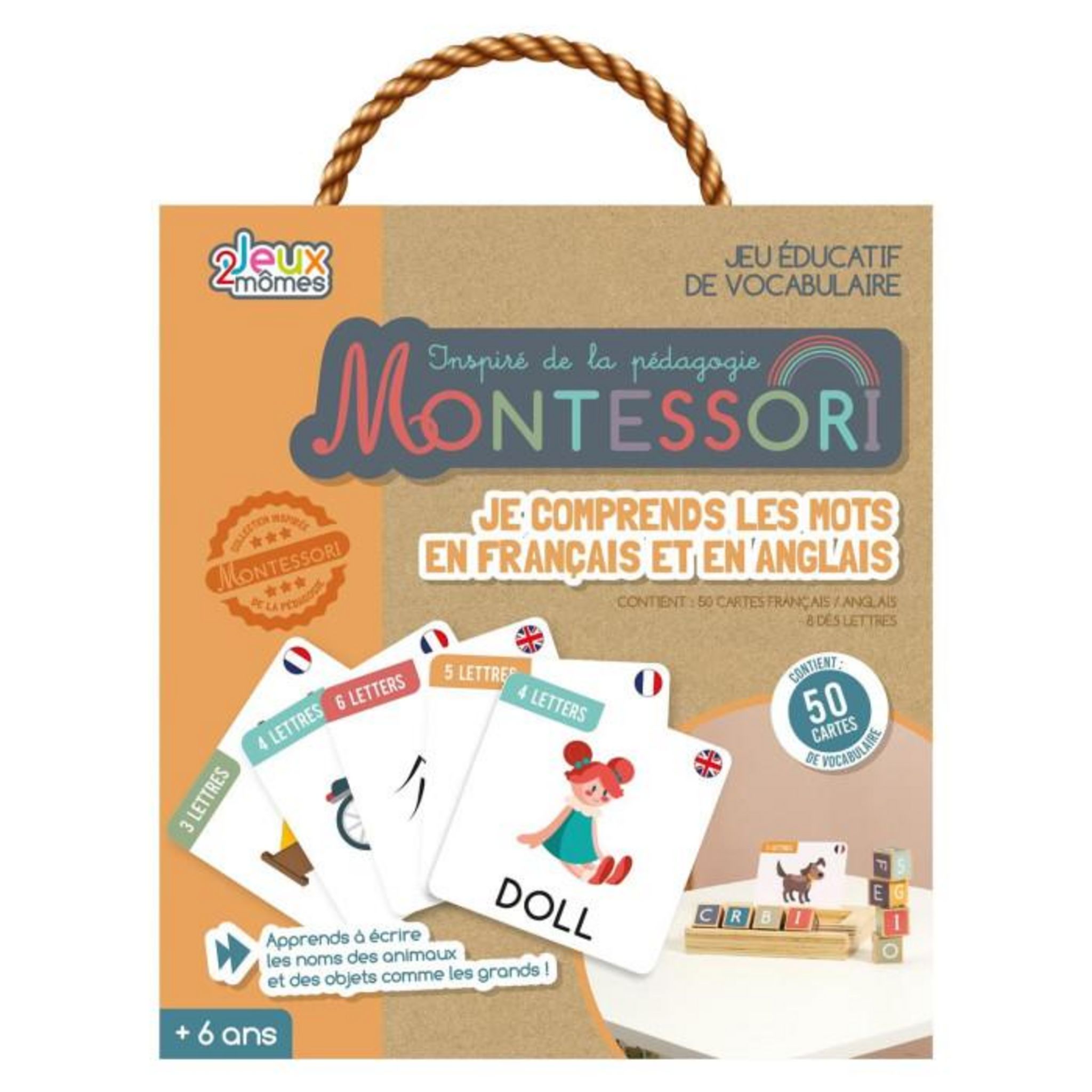 Informations Techniques : Dimensions : L. 15 x l. 13,1 x H. 2,5 cm Matière : Bois & Contreplaqué Spécificités : Pratique & Utile Jeu Éducatif Inspiré de la Pédagogie Montessori Je Comprends les Mots 50 Cartes Français & Anglais de Vocabulaire 8 Dés Lettres Apprendre à Écrire les Nombres des Animaux
