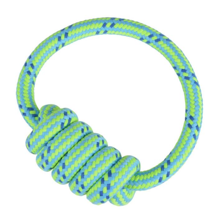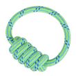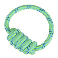 Informations Techniques : Dimensions : D. 18 x H. 5,5 cm Matière : Coton Spécificités : Pratique & Résitant Jouet pour chien Corde noeud Avec poignée Pour s'amuser & rester en forme Poids : 0,16 kg Couleur : Bleu & Vert