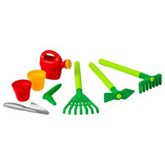 Contient : 1 râteu, 1 pioche, 1 ramasse feuille, 1 arrosoir, 1 pelle, 2 post de fleurs, 1 plantoir