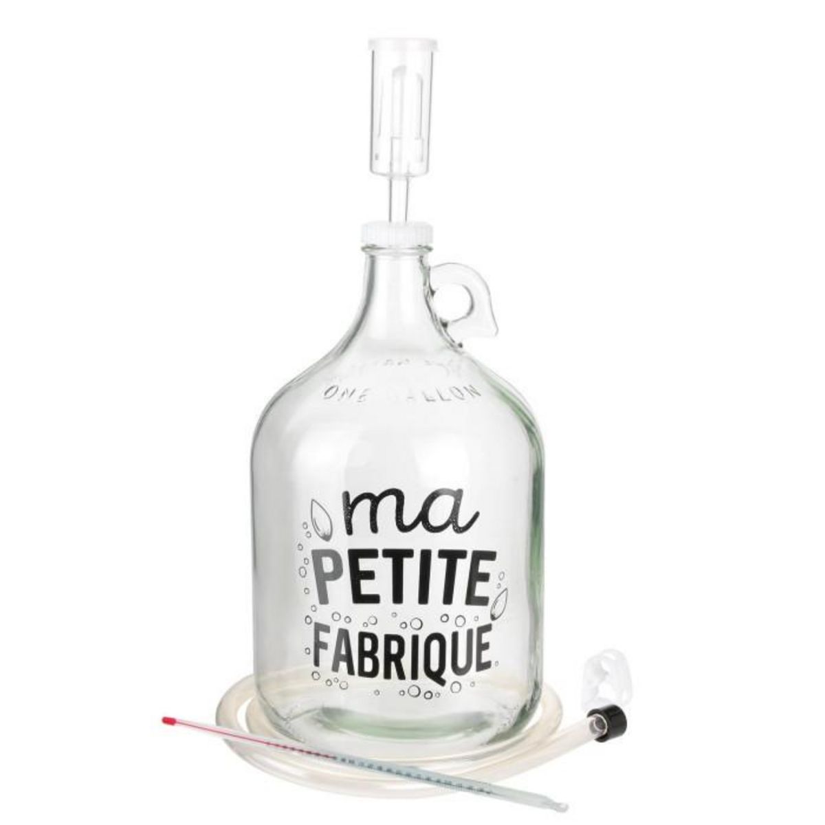 Informations Techniques : Dimensions : D. 17 x H. 29,5 cm Matière : Verre Spécificités : Utile & Pratique Kit fabrique à Bière Contient 1 bonbonne en verre Dame Jeanne , 1 bouchon percé et barboteur en U, 1 thermomètre en verre, 1 système de soutirage avec anti-lie et valve & 1 notice détaillée