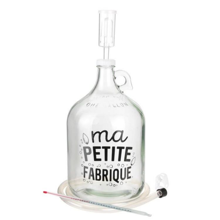 Contient 1 bonbonne en verre Dame Jeanne , 1 bouchon percé et barboteur en U, 1 thermomètre en verre, 1 système de soutirage avec anti-lie et valve & 1 notice détaillée de la méthode tout grain
