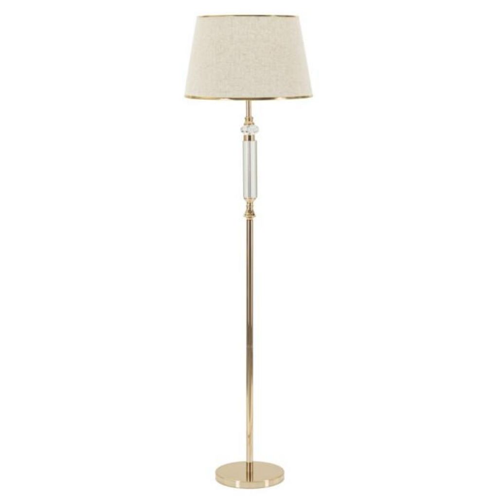 Informations Techniques : Dimensions : L. 45 x l. 45 x H. 165 cm Matières : Verre, Métal & Tissu Spécificités : Élégant & Utile Lampadaire design Abat-jour en tissu Ampoule non incluse Douille : E27 Puissance : 40 W Voltage : 220 V Fréquence : 50 Hz Poids : 5 kg Couleur : Or