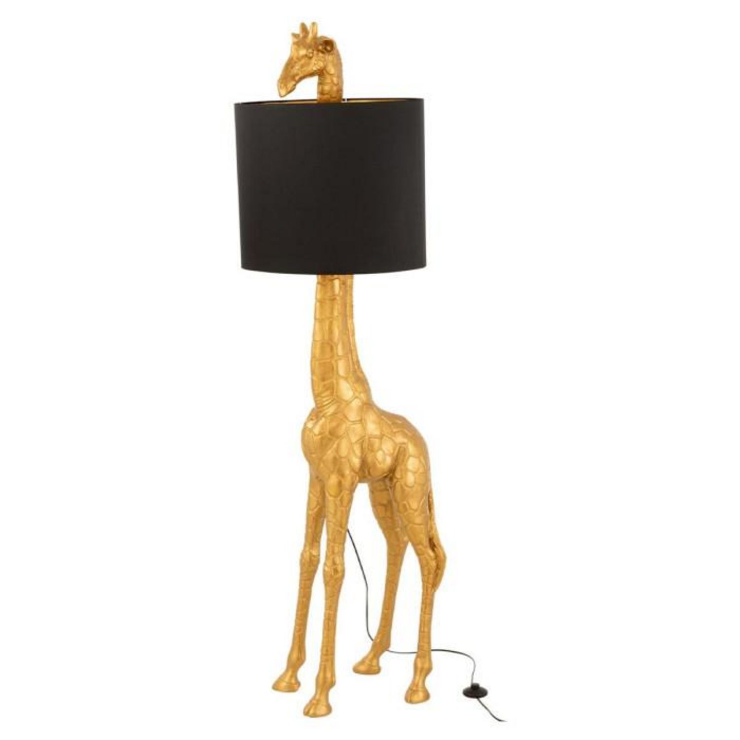 Informations Techniques : Dimensions : L. 53 x l. 33,5 x H. 179 cm Câble : L. 400 cm Matières : Résine & Textile Spécificités : Tendance & Moderne Lampadaire Design Forme Ronde Design Girafe Douille E27 Puissance maximale : 60 W A monter soi-même Poids : 9 kg Couleur : Or & Noir