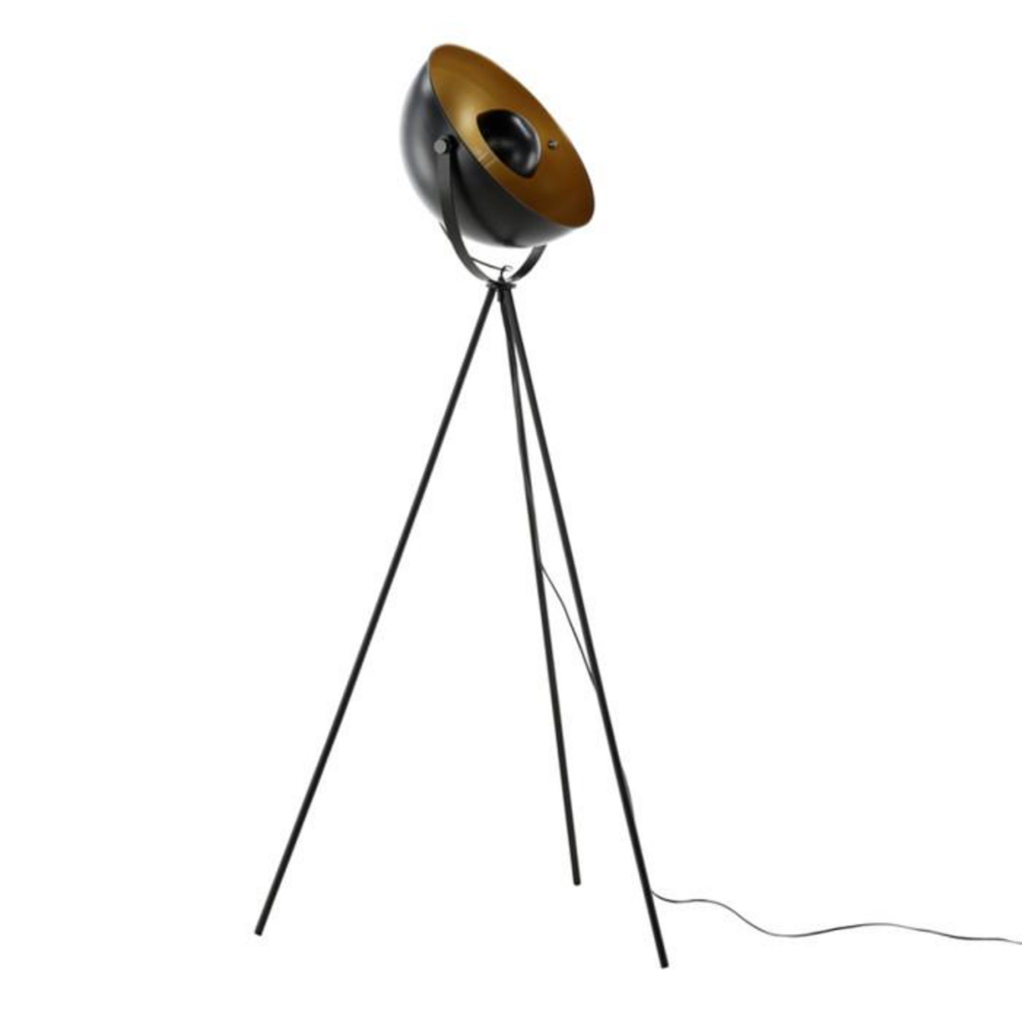 Informations Techniques : Dimensions : L. 70 x l. 41 x H. 159 cm Matières : Acier & PVC Spécificités : Élégant & Design Lampadaire trépied Intérieur doré Ampoule non incluse Douille : E27 Puissance : 40W Poids : 3,5 kg Couleur : Noir