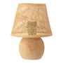 Informations Techniques : Dimensions : L. 17 x l. 17 x H. 23 cm Matières : 56% Bois (Pin), 12% Rotin, 18% Métal & 14% Plastique Spécificités : Tendance & Utile Lampe de table à LED Abat-jour ajouré en rotin Poids : 0,4 kg Couleur : Naturel