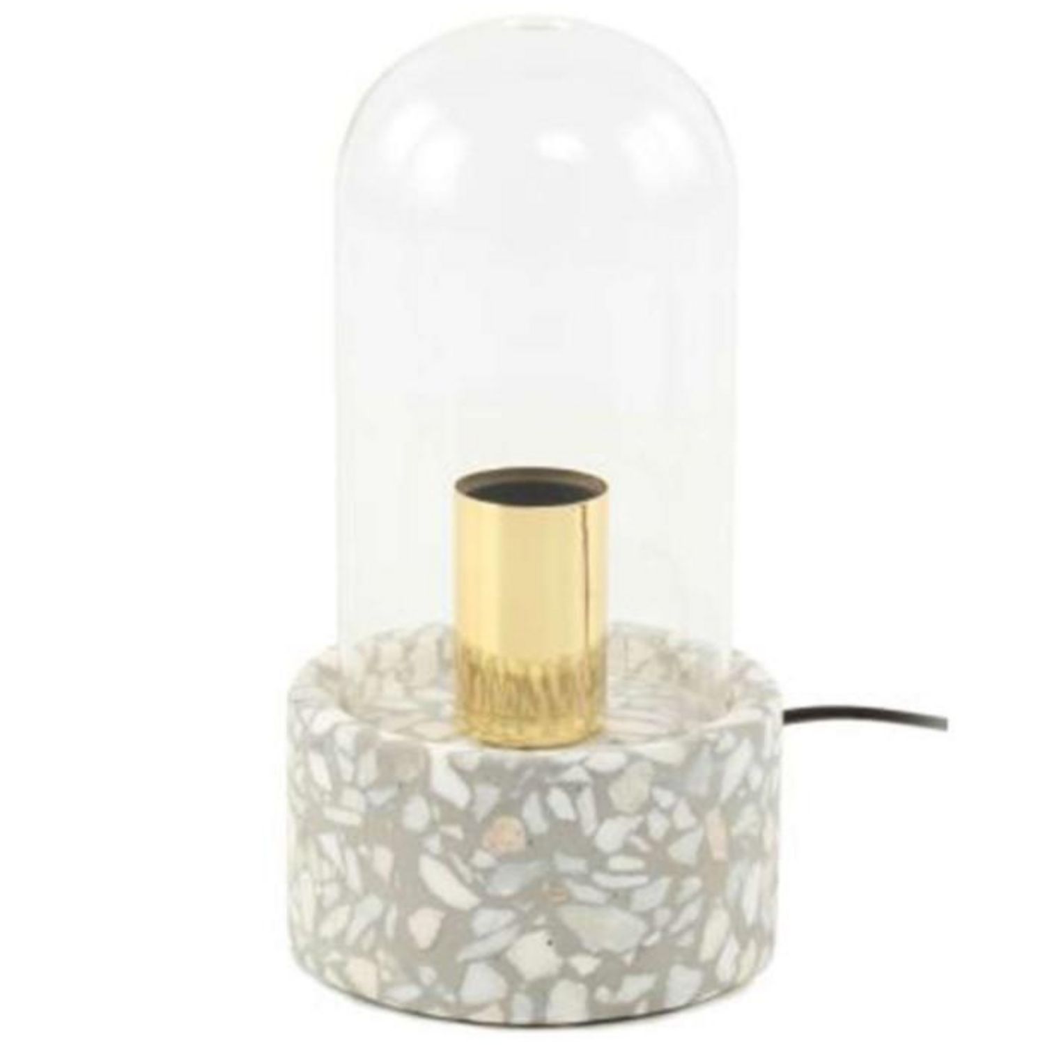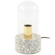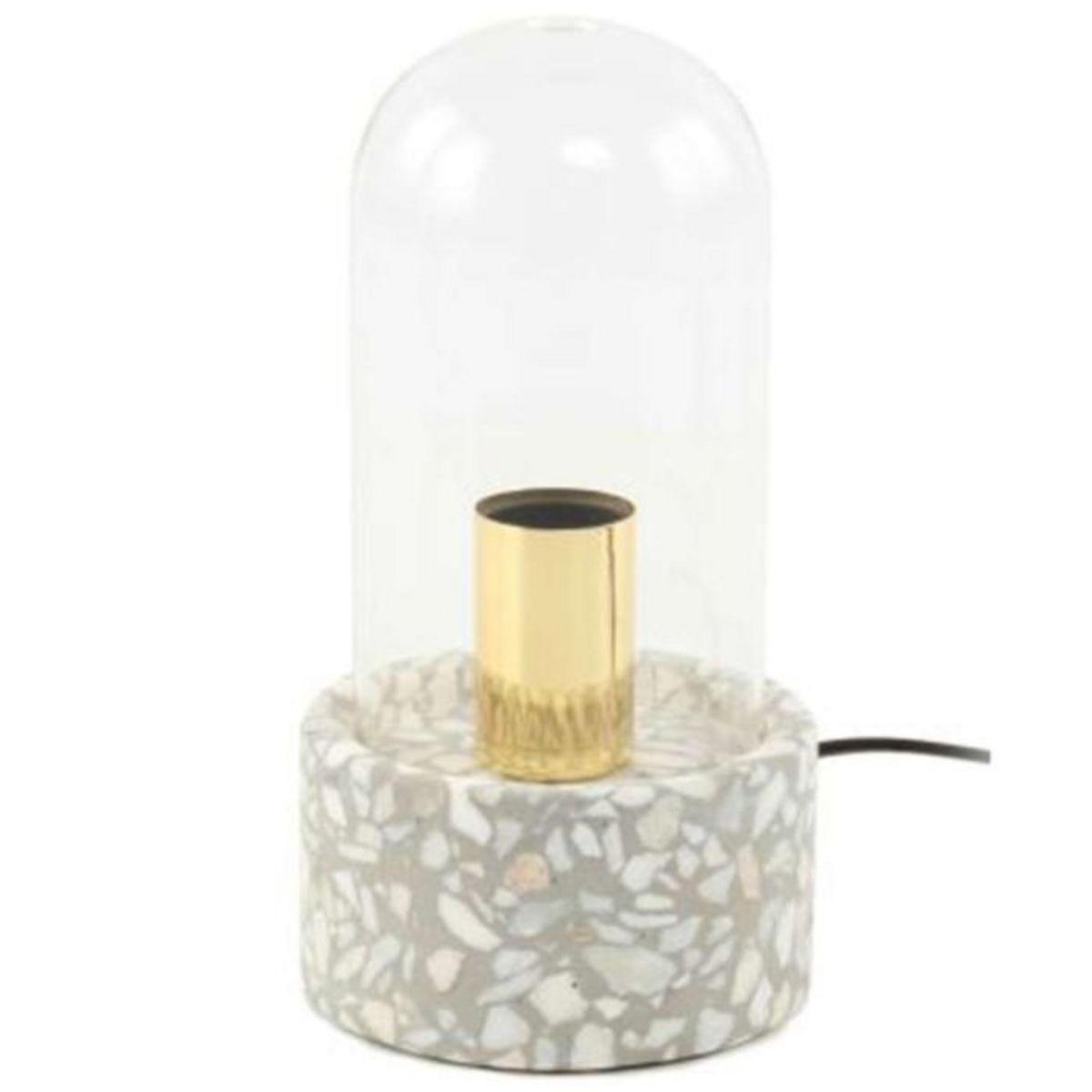 Informations Techniques : Dimensions : L. 12,5 x l. 12,5 x H. 24 cm Longueur du câble : L. 150 cm Matières : Pierre & Ciment Spécificités : Design & Tendance Lampe à Poser Déco Avec Dôme en Verre Base Ronde en Terrazzo Type de Culot : E27 Puissance : 1 x 40W Ampoule Non Incluse Fait Main Poids : 150