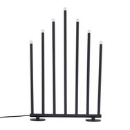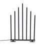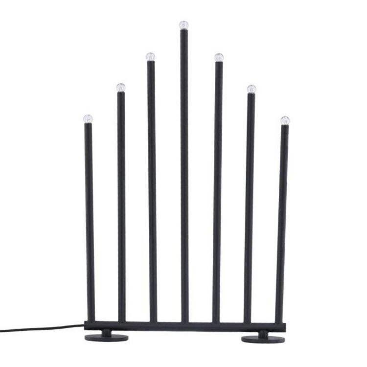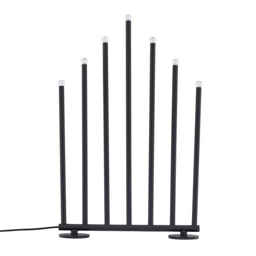 Informations Techniques : Dimensions : L. 32 x l. 7 x H. 50 cm Matières : Acier & PVC Spécificités : Pratique & Tendance Lampe à poser Type bougeoir Avec 7 têtes Forme pyramidale Douille : E10 (incluses) Puissance : 7 x 0,5 W Poids : 1,8 kg Couleur : Noir