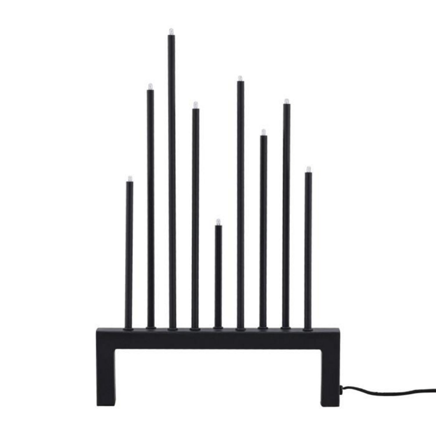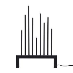 Informations Techniques : Dimensions : L. 27 x l. 6 x H. 42 cm Matières : Acier & Plastique Spécificités : Pratique & Tendance Lampe à poser déco Type bougeoir Avec 9 têtes Douille : E5 (incluses) Puissance : 9 x 0,5 W Poids : 1,4 kg Couleur : Noir
