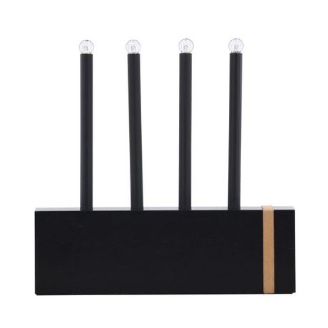 Informations Techniques : Dimensions : L. 25 x l. 6 x H. 25 cm Matières : Bois (Pin) & PVC Spécificités : Pratique & Tendance Lampe à poser déco Type bougeoir Avec 4 têtes Douille : E10 (incluses) Puissance : 4 x 0,5 W Poids : 1 kg Couleur : Noir