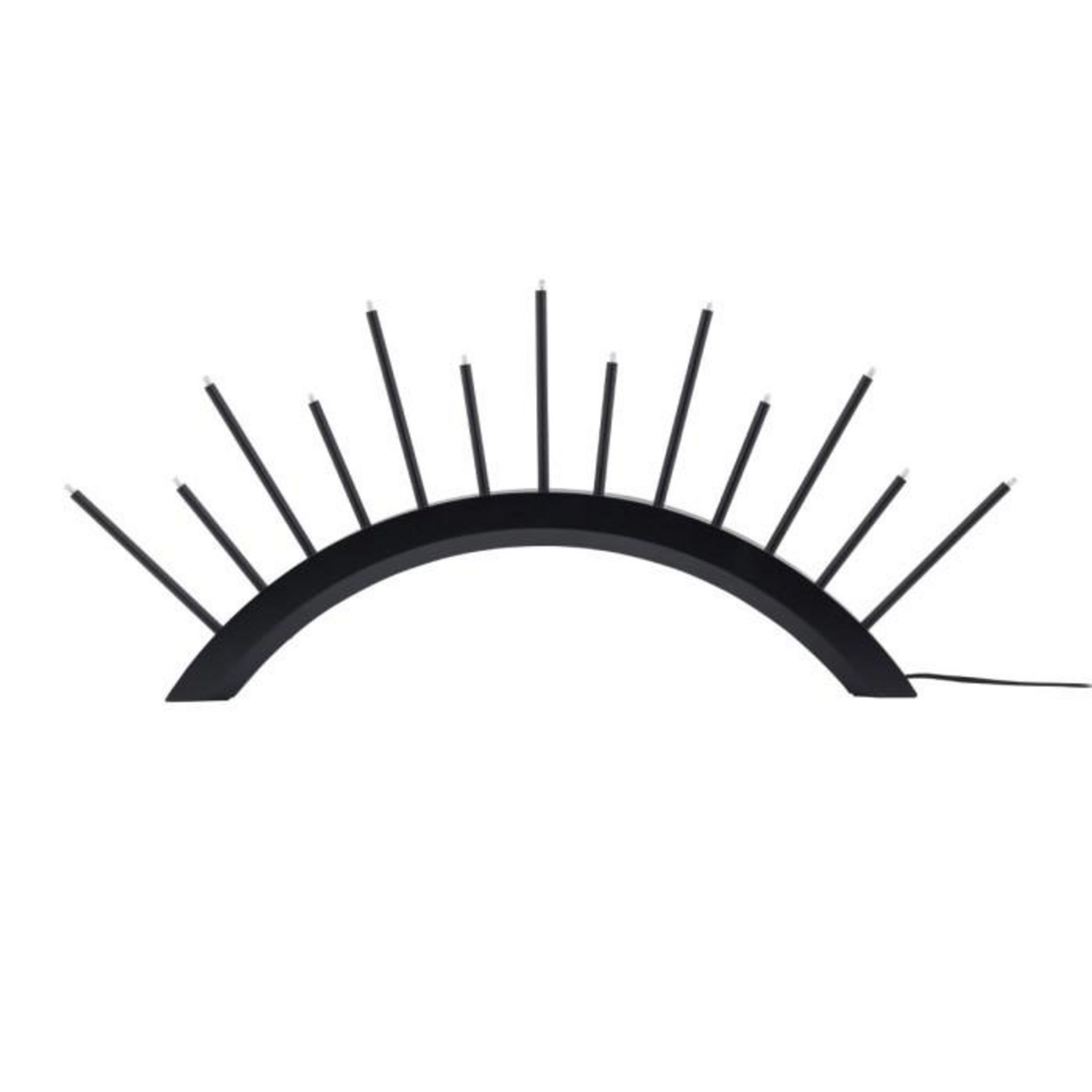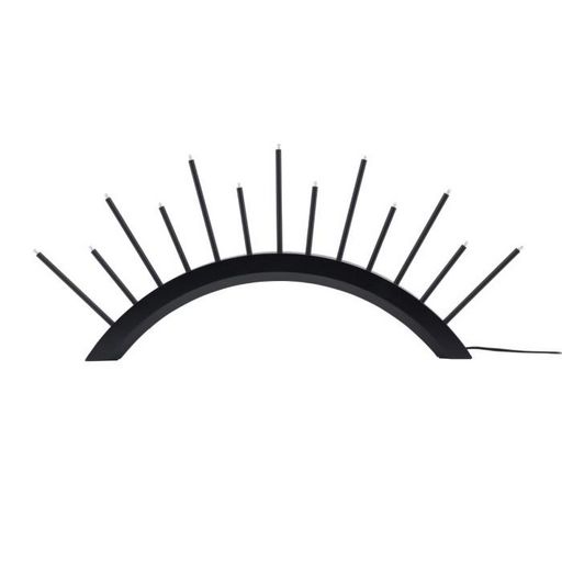 Informations Techniques : Dimensions : L. 55 x l. 6 x H. 30 cm Matières : MDF & PVC Spécificités : Pratique & Tendance Lampe à poser déco Type bougeoir Avec 13 têtes Douille : E5 (incluses) Puissance : 13 x 0,5 W Poids : 1,8 kg Couleur : Noir