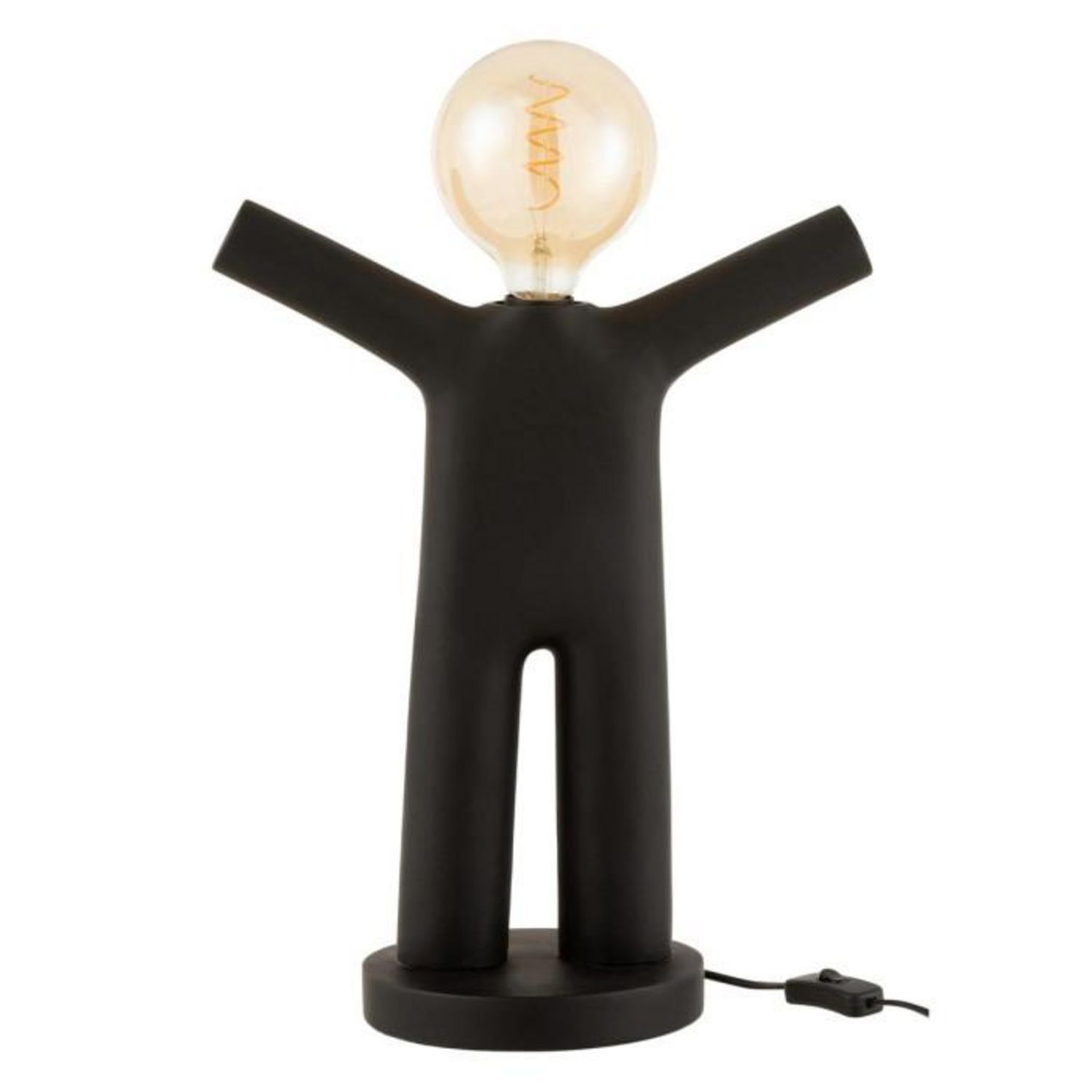 Informations Techniques : Dimensions : L. 36 x l. 18,5 x H. 44,5 cm Câble : L. 200 cm Matière : Résine Spécificités : Tendance & Moderne Lampe à Poser Design Bonhomme Douille E27 Puissance maximale : 60 W Poids : 2,06 kg Couleur : Noir