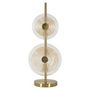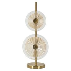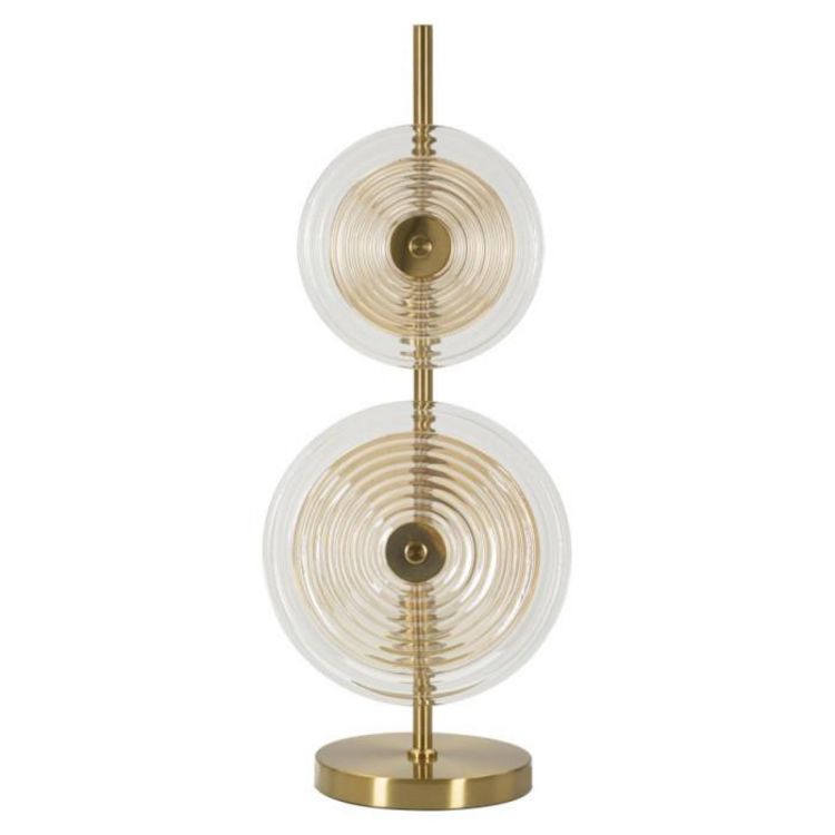 Informations Techniques : Dimensions : L. 25 x l. 25 x H. 63 cm Matières : Métal & Verre Spécificités : Chic & Utile Lampe de table design Abat-jours disques ronds Ampoules non incluses Douille : E14 Puissance : 40 W Voltage : 220 V Fréquence : 50 Hz Poids : 3 kg Couleur : Or, Marron & Transparent