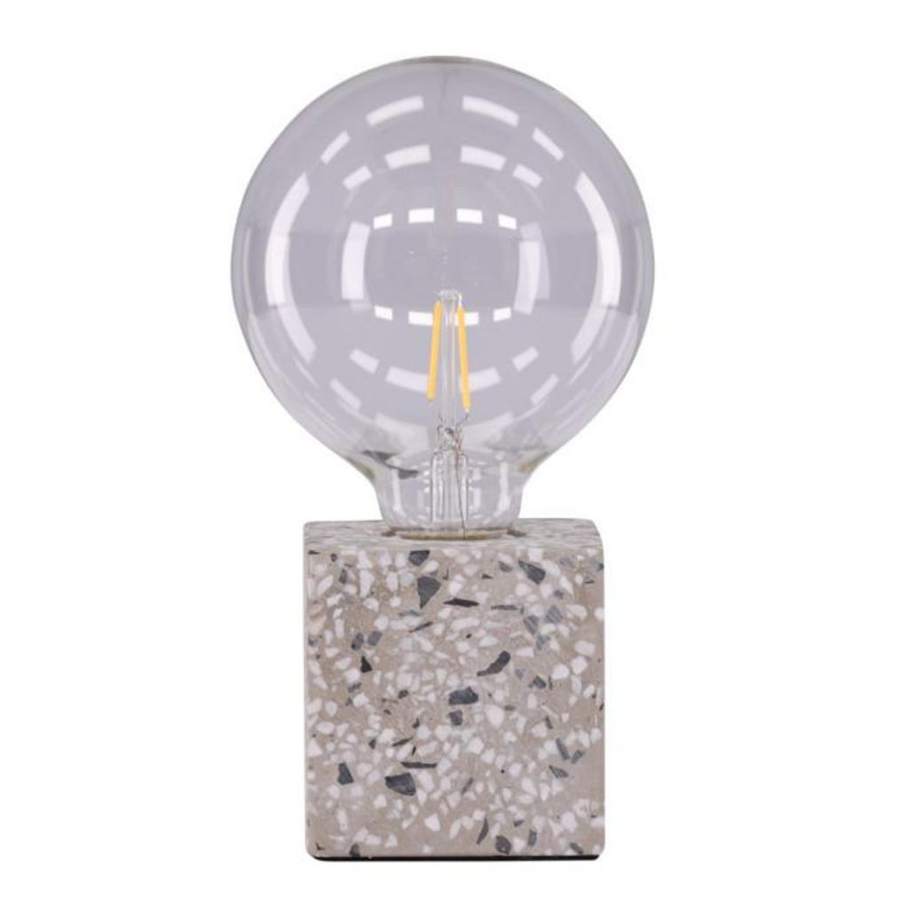 Informations Techniques : Dimensions : L. 9 x l. 9 x H. 9 cm Matières : Pierre & PVC Spécificités : Pratique & Tendance Lampe à poser design Cube en terrazzo Ampoule non incluse Douille : E27 Puissance : 25 W Poids : 1,5 kg Couleur : Blanc