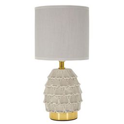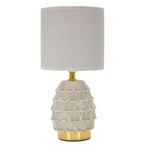 Informations Techniques : Dimensions : L. 15 x l. 15 x H. 30,5 cm Matières : Céramique, Métal & Tissu Spécificités : Elégante & Utile Lampe de table design Base en forme de pomme de pin Abat-jour en tissu Ampoule non incluse Douille : E14 Puissance : 40 W Voltage : 220 V Fréquence : 50 Hz Poids : 0,