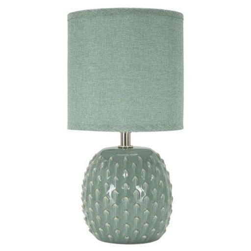 Informations Techniques : Dimensions : L. 14 x l. 14 x H. 27 cm Matières : Céramique, Métal & Tissu Spécificités : Colorée & Utile Lampe de table design Base avec motifs en relief Abat-jour en tissu Ampoule non incluse Douille : E14 Puissance : 40 W Voltage : 220 V Fréquence : 50 Hz Poids : 0,55 kg