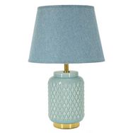 Informations Techniques : Dimensions : L. 28 x l. 28 x H. 44 cm Matières : Céramique, Métal & Tissu Spécificités : Colorée & Utile Lampe de table design Base avec losanges en relief Abat-jour en tissu Ampoule non incluse Douille : E27 Puissance : 40 W Voltage : 220 V Fréquence : 50 Hz Poids : 1,15 k
