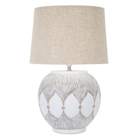 Informations Techniques : Dimensions : L. 38 x l. 38 x H. 59 cm Abat-jour : L. 38 x l. 38 x H. 26 cm Matières : Polyrésine, Métal & Tissu Spécificités : Déco & Utile Lampe de table ronde Base avec motifs feuilles Abat-jour en tissu Ampoule non incluse Douille : E27 Puissance : 40 W Voltage : 220 V F