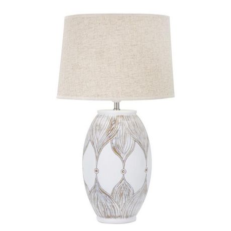 Informations Techniques : Dimensions : L. 38 x l. 38 x H. 67 cm Matières : Polyrésine, Métal & Tissu Spécificités : Déco & Utile Lampe de table ovale Base avec motifs feuilles Abat-jour en tissu Ampoule non incluse Douille : E27 Puissance : 40 W Voltage : 220 V Fréquence : 50 Hz Poids : 3,5 kg Coule