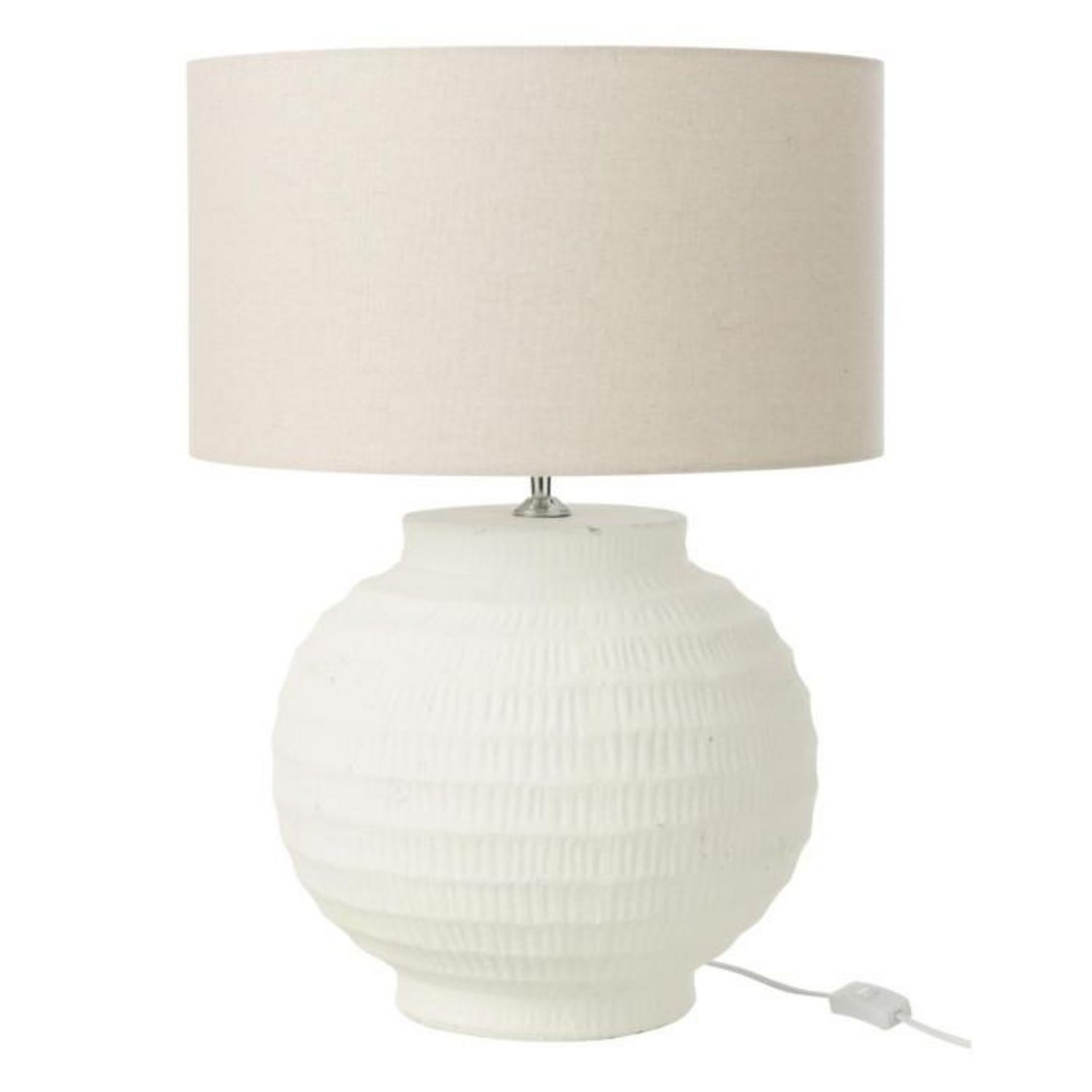 Informations Techniques : Dimensions : D. 46 x H. 62 cm Matières : 60% Terre Cuite & 40% Tissu Spécificités : Tendance & Utile Lampe à poser ronde Abat-jour en tissu Interrupteur on/off Ampoule non incluse Douille : E27 Puissance : 60 W Poids : 5 kg Couleur : Blanc