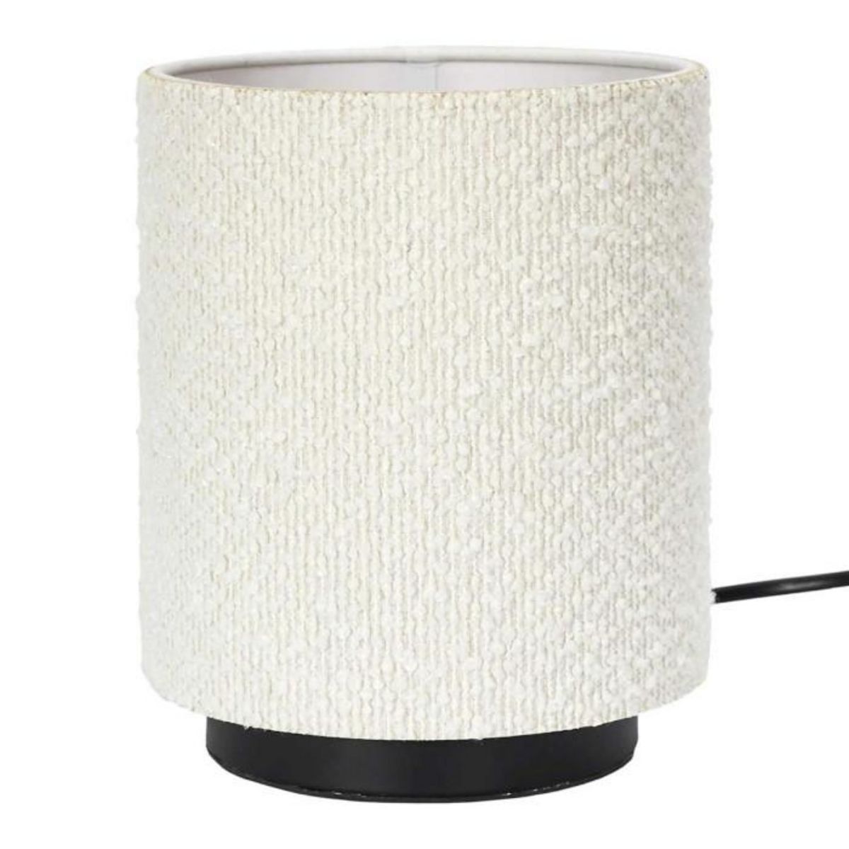 Informations Techniques : Dimensions : D. 15 x H. 20 cm Matières : Polyacrylique & Métal Spécificités : Tendance & Utile Lampe de table cylindrique Design tissu bouclette Poids : 0,3 kg Couleur : Naturel & Noir