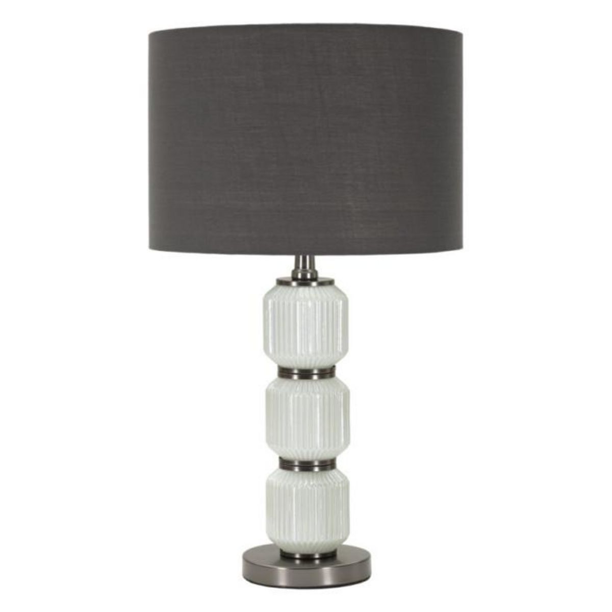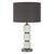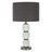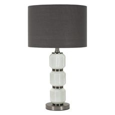 Informations Techniques : Dimensions : L. 32,5 x l. 32,5 x H. 57 cm Matières : Verre, Métal & Tissu Spécificités : Elégante & Utile Lampe de table design Abat-jour en tissu Ampoule non incluse Douille : E27 Puissance : 40 W Voltage : 220 V Fréquence : 50 Hz Poids : 1,6 kg Couleur : Blanc & Gris