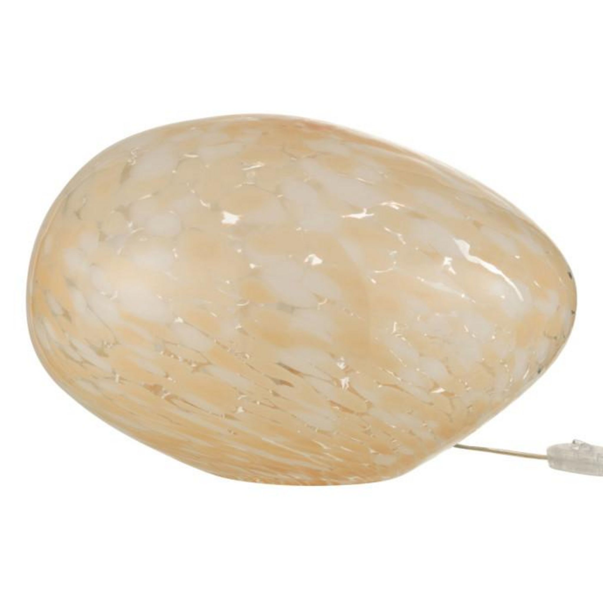 Informations Techniques : Dimensions : L. 40 x l. 30 x H. 24 cm Câble : L. 175 cm Matière : Verre Spécificités : Déco & Utile Lampe à poser Forme Ovale Alimentation Secteur Ampoule Non Incluse Douille E14 Puissance : 25W Poids : 3,6 kg Couleur : Beige