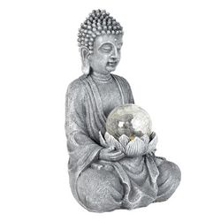 Informations Techniques : Dimensions : L. 17 x l. 13,5 x H. 26,5 cm Matières : Résine & Polystyrène Spécificités : Pratique & Utile Lampe Solaire à LED A Poser Design Bouddha Usage intérieur & extérieur Poids : 0,664 kg Couleur : Gris