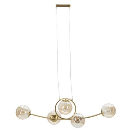 Informations Techniques : Dimensions : L. 100 x l. 30 x H. 30 cm Matières : Métal & Verre Spécificités : Élégante & Design Suspension 5 têtes Abat-jours sphères en verre Ampoules non incluses Douille : E14 Puissance : 20 W Voltage : 220 V Fréquence : 50 Hz Poids : 2,5 kg Couleur : Or & Blanc