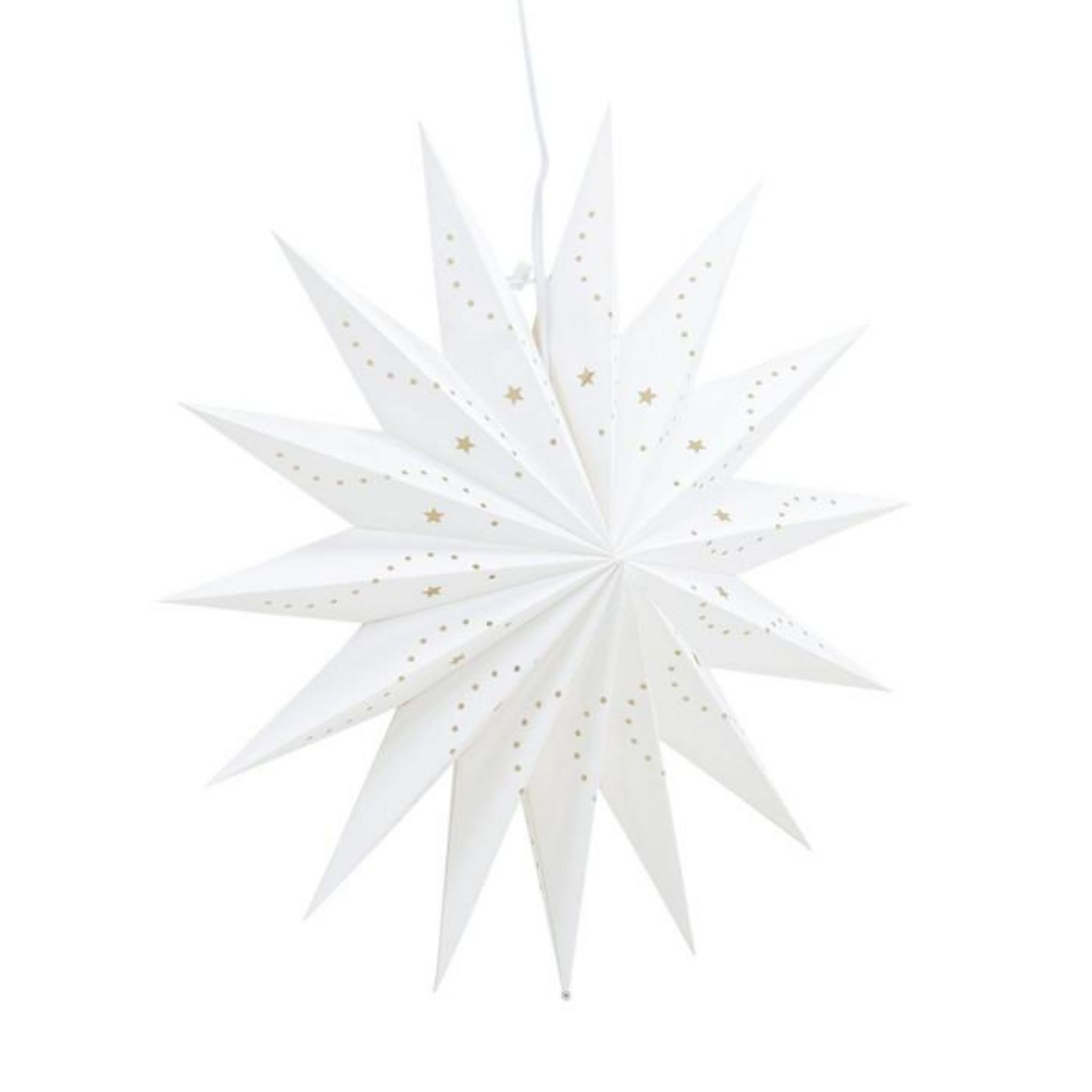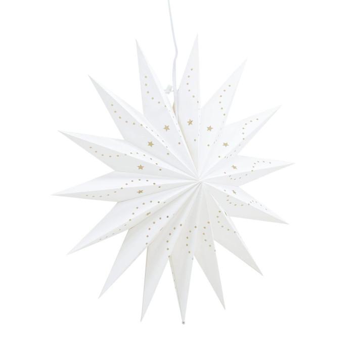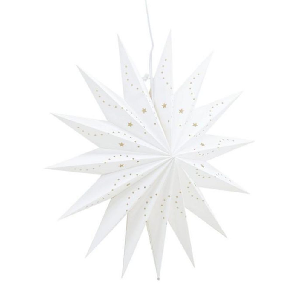 Informations Techniques : Dimensions : D. 51 cm Matières : Papier & PVC Spécificités : Pratique & Tendance Lampe suspension Design étoile Ampoule non incluse Douille : E14 Poids : 0,4 kg Couleur : Blanc