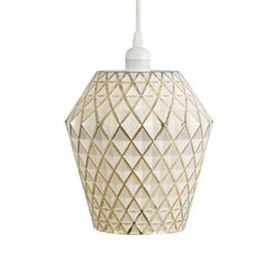 Informations Techniques : Dimensions : L. 20 x l. 20 x H. 27 cm Longueur du câble : L. 100 cm Matière : Verre Spécificités : Moderne & Tendance Lampe Suspension Déco Type de Culot : E27 Puissance : 1 x 60W Ampoule Non Incluse Fait à la Main Poids : 1200 g Couleur : Blanc & Or