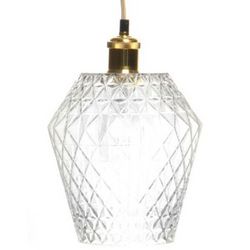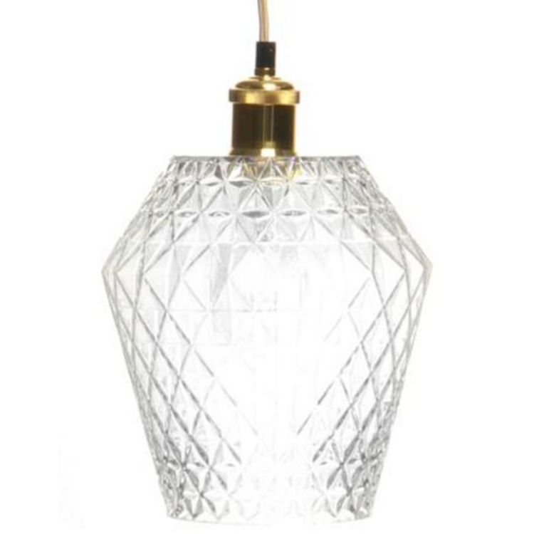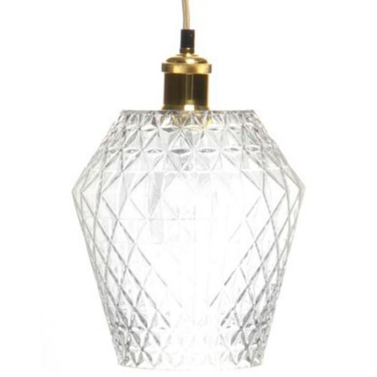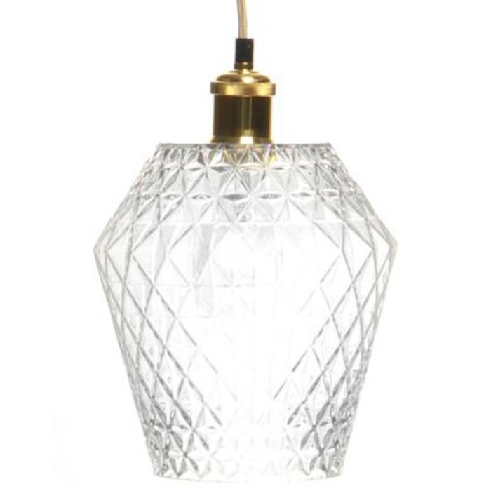 Informations Techniques : Dimensions : L. 20 x l. 20 x H. 27 cm Longueur du câble : L. 100 cm Matière : Verre Spécificités : Moderne & Tendance Lampe Suspension Déco Type de Culot : E27 Puissance : 1 x 40W Ampoule Non Incluse Fait à la Main Poids : 1200 g Couleur : Transparent & Or
