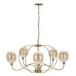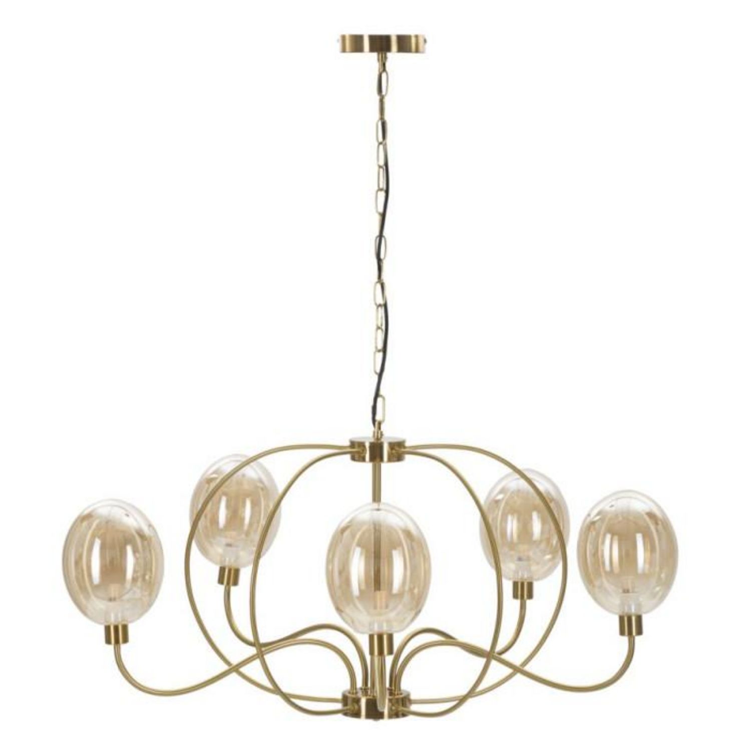 Informations Techniques : Dimensions : L. 100 x l. 100 x H. 96 cm Matières : Métal & Verre Spécificités : Élégante & Design Suspension 5 têtes Abat-jours en verre fumé Ampoules non incluses Douille : E14 Puissance : 20 W Voltage : 220 V Fréquence : 50 Hz Couleur : Or