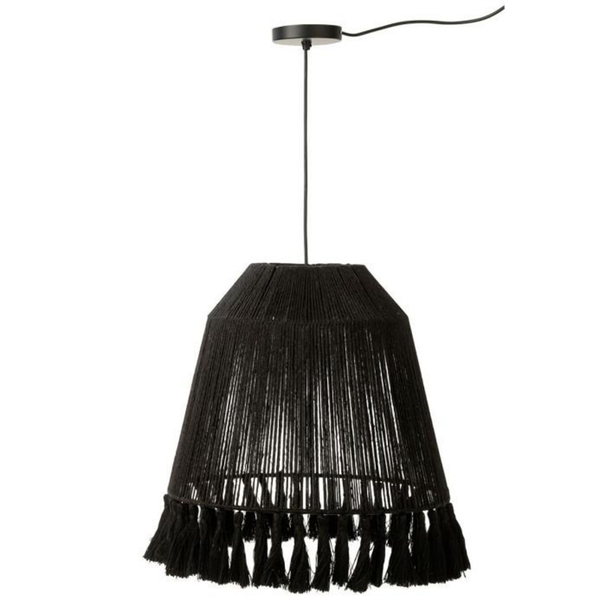 Informations Techniques : Dimensions : D. 53 x H. 53 cm Câble : L. 90 cm Matière : Métal Spécificités : Déco & Utile Lampe suspension Avec pompons Ampoule non incluse Douille : E27 Puissance : 40W Poids : 1,79 kg Couleur : Noir