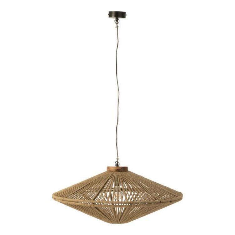 Informations Techniques : Dimensions : L. 77,5 x l. 77,5 x H. 36 cm Câble : L. 90 cm Matières : 60% Métal, 35% Jute & 5% Bois (Manguier) Spécificités : Utile & Tendance Suspension ajourée Ampoule non incluse À monter soi-même Douille : E27 Puissance : 25W Poids : 4,5 kg Couleur : Naturel
