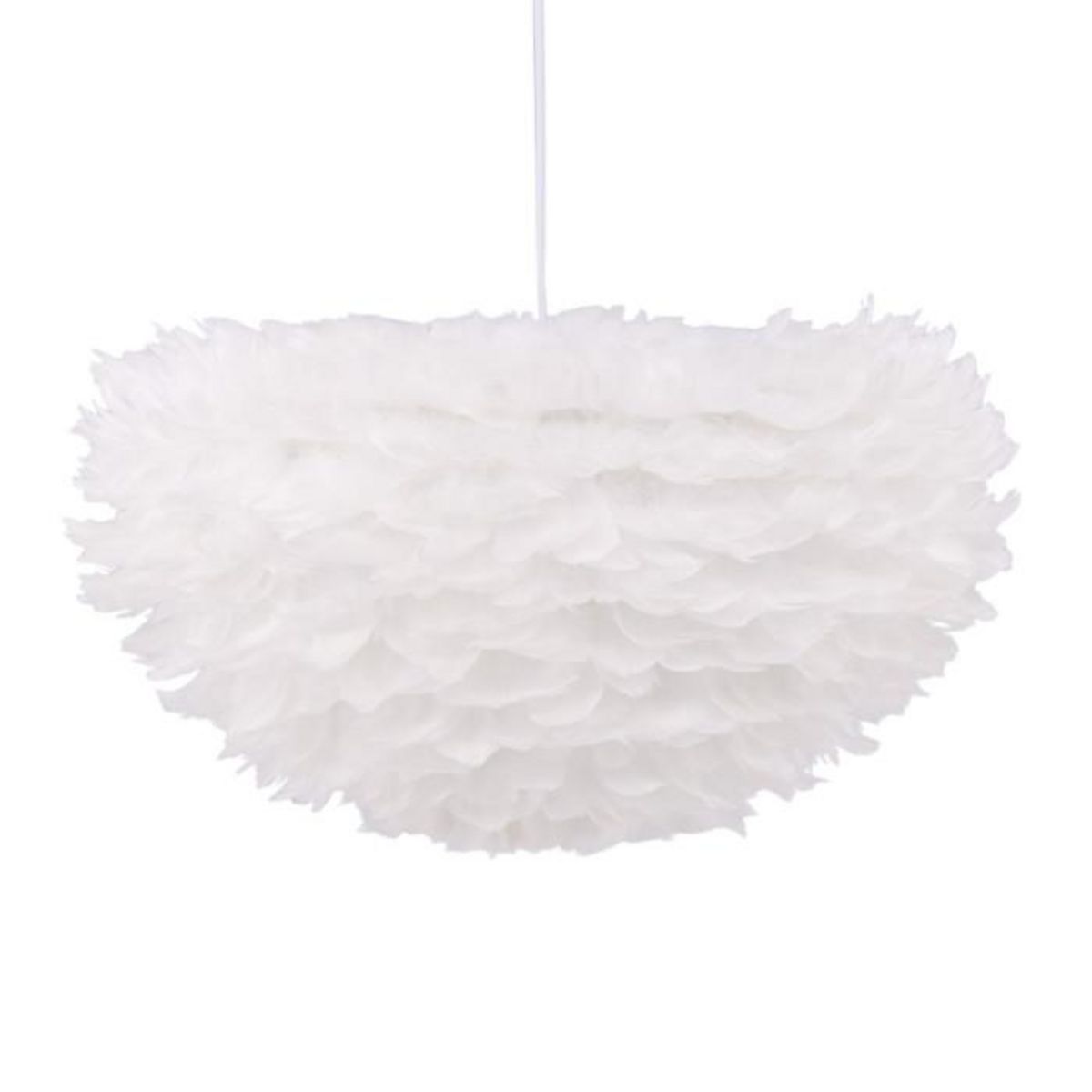 Informations Techniques : Dimensions : L. 60 x l. 60 x H. 30 cm Matière : Plumes, Métal & PVC Spécificités : Pratique & Tendance Suspension déco Avec plumes artificielles Forme arrondie Ampoule non incluse Douille : E27 Puissance : 75 W Poids : 2,8 kg Couleur : Blanc