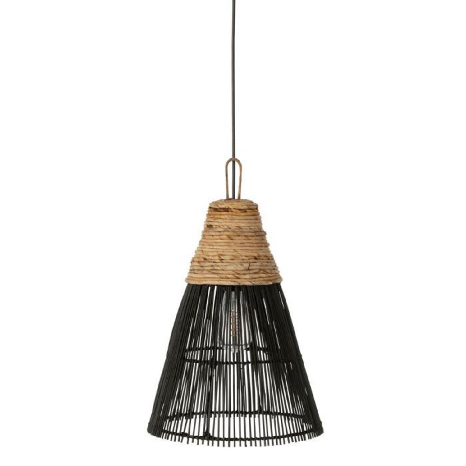 Informations Techniques : Dimensions : D. 31,5 x H. 42 cm Matières : 70% Rotin, 20% Jacinthe d'eau & 10% Métal Spécificités : Tendance & Naturelle Abat-jour en rotin Design cone Ampoule non incluse Poids : 0,66 kg Couleur : Noir