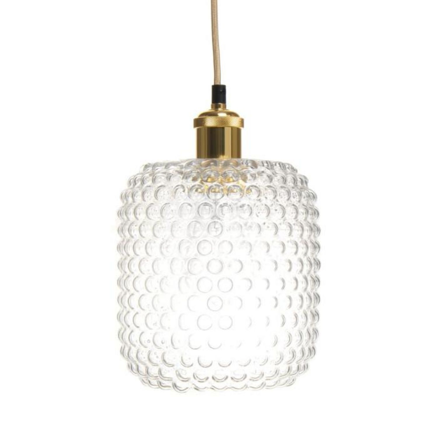 Informations Techniques : Dimensions : L. 20 x l. 20 x H. 27 cm Longueur du câble : L. 100 cm Matière : Verre Spécificités : Moderne & Tendance Lampe Suspension Déco Type de Culot : E27 Puissance : 1 x 40W Ampoule Non Incluse Fait à la Main Poids : 1100 g Couleur : Transparent