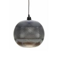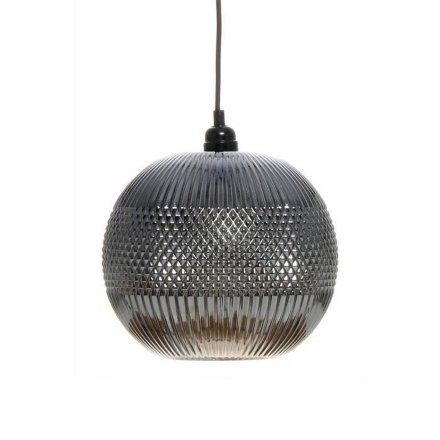 Informations Techniques : Dimensions : L. 25 x l. 25 x H. 26 cm Longueur du câble : L. 100 cm Matière : Verre Spécificités : Moderne & Tendance Lampe Suspension Déco Type de Culot : E27 Puissance : 1 x 60W Ampoule Non Incluse Fait à la Main Poids : 1500 g Couleur : Argent & Gris