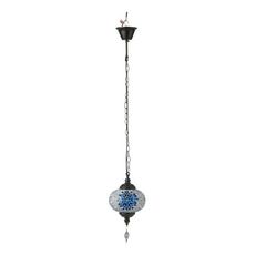 Informations Techniques : Dimensions : L. 18 x l. 18 x H. 80 cm Câble : L. 100 cm Matières : 50% Verre & 40% Métal Spécificités : Colorée & Utile Suspension design mosaïque Ampoule non incluse Douille : E27 Puissance : 60 W Poids : 1,07 kg Couleur : Bleu