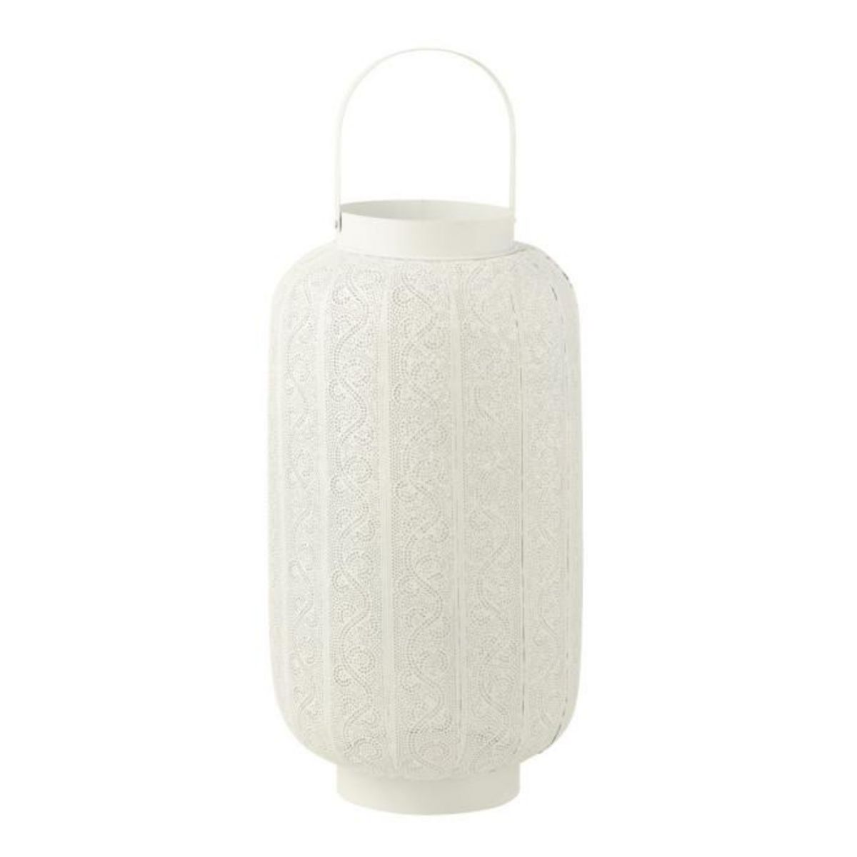 Informations Techniques : Dimensions : L. 37,5 x l. 37,5 x H. 70 cm Matières : 80% Métal & 20% Verre Spécificités : Pratique & Utile Lanterne déco Avec anse Motif sculpté Style oriental Forme ronde Poids : 3,07 kg Couleur : Blanc