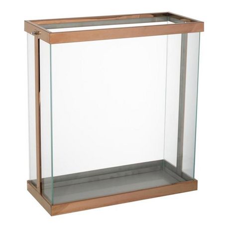 Informations Techniques : Dimensions : L. 41,5 x l. 18 x H. 45 cm Matières : 50% Verre & 50% Métal Spécificités : Moderne & Déco Lanterne rectangulaire Pour 3 bougies (non incluses) Poids : 4,9 kg Couleur : Cuivre