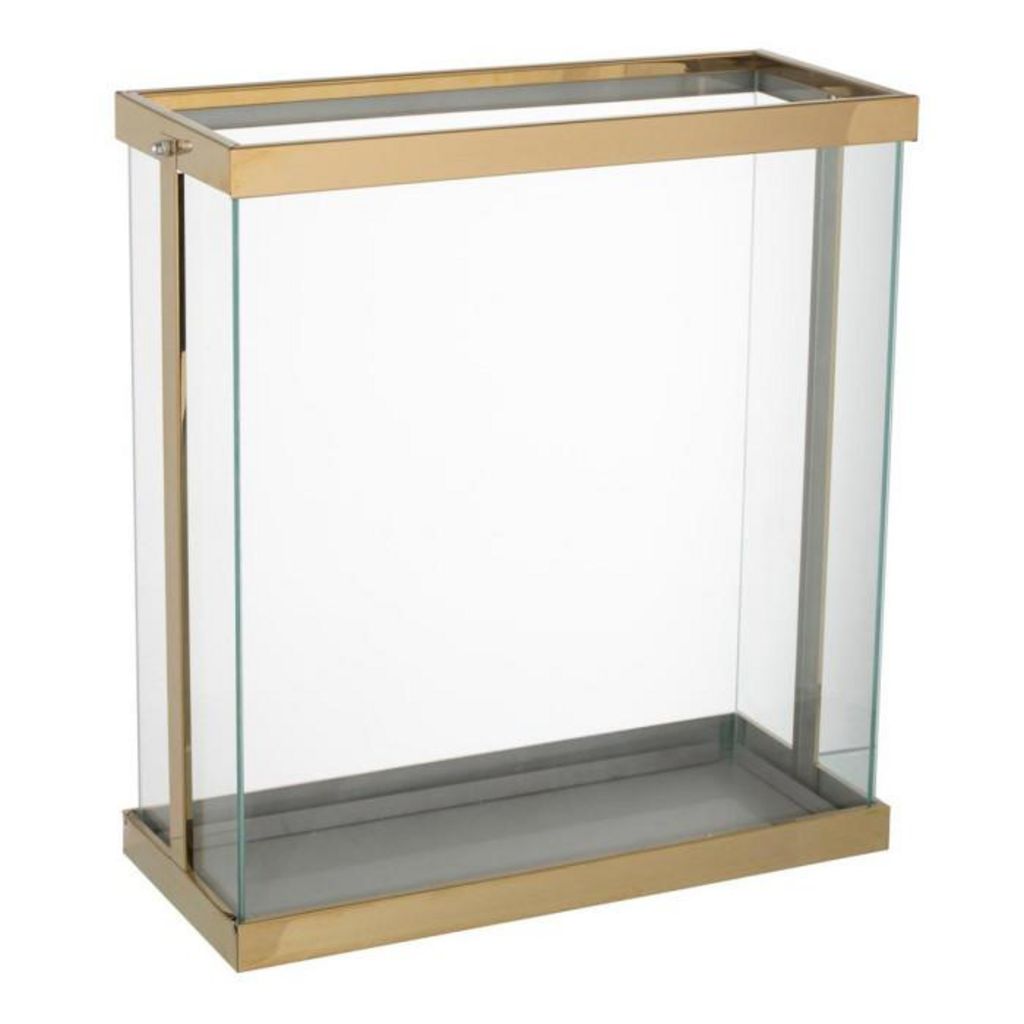 Informations Techniques : Dimensions : L. 41,5 x l. 18 x H. 45 cm Matières : 50% Verre & 50% Métal Spécificités : Moderne & Déco Lanterne rectangulaire Pour 3 bougies (non incluses) Poids : 4,9 kg Couleur : Or